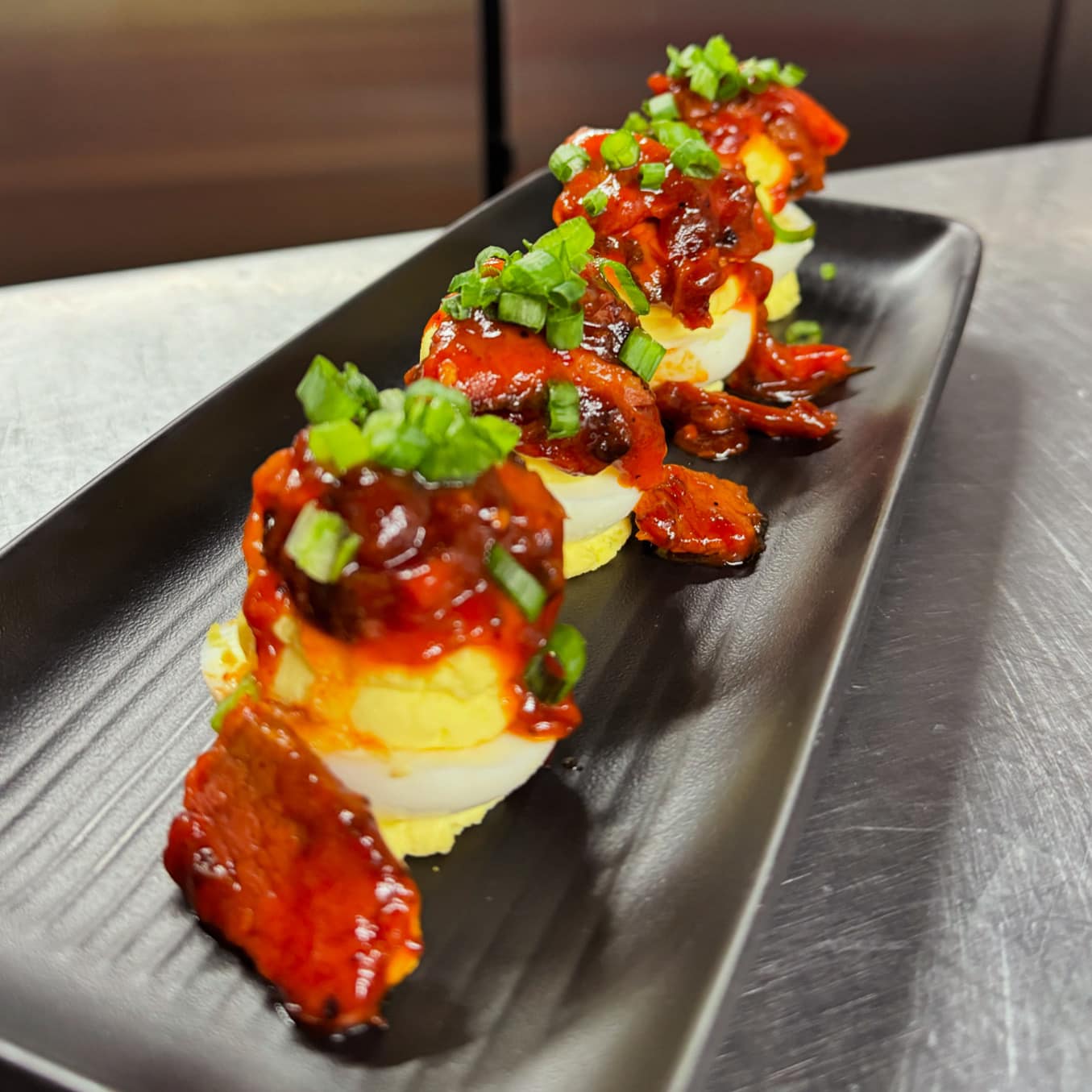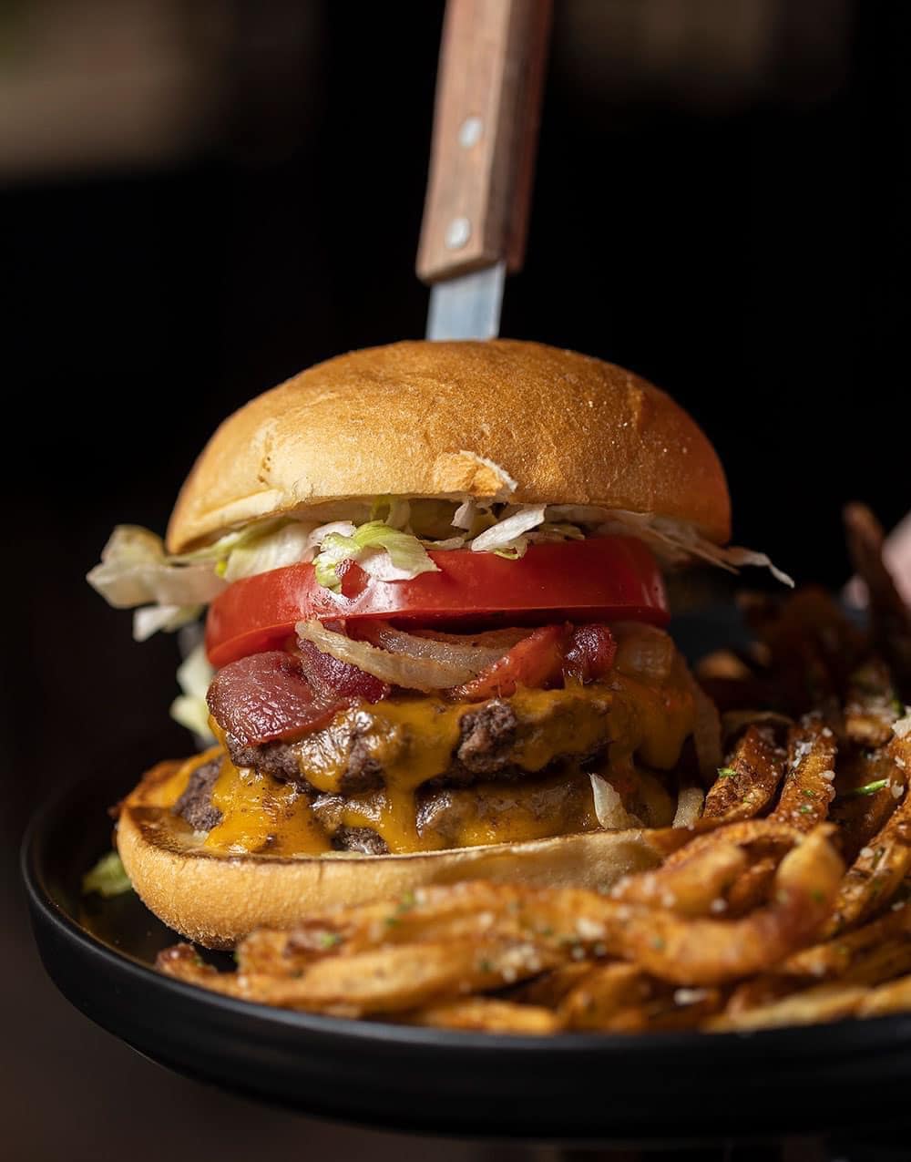 Small Plates: Crab cakes, garlic cheese curds, and their famous Cowgirl Candy Mac—cavatappi pasta smothered in housemade cheddar sauce, topped with smoked BBQ brisket, and finished with scallions. Don’t miss the Juicy Bread, grilled ciabatta brushed with garlic herb butter.