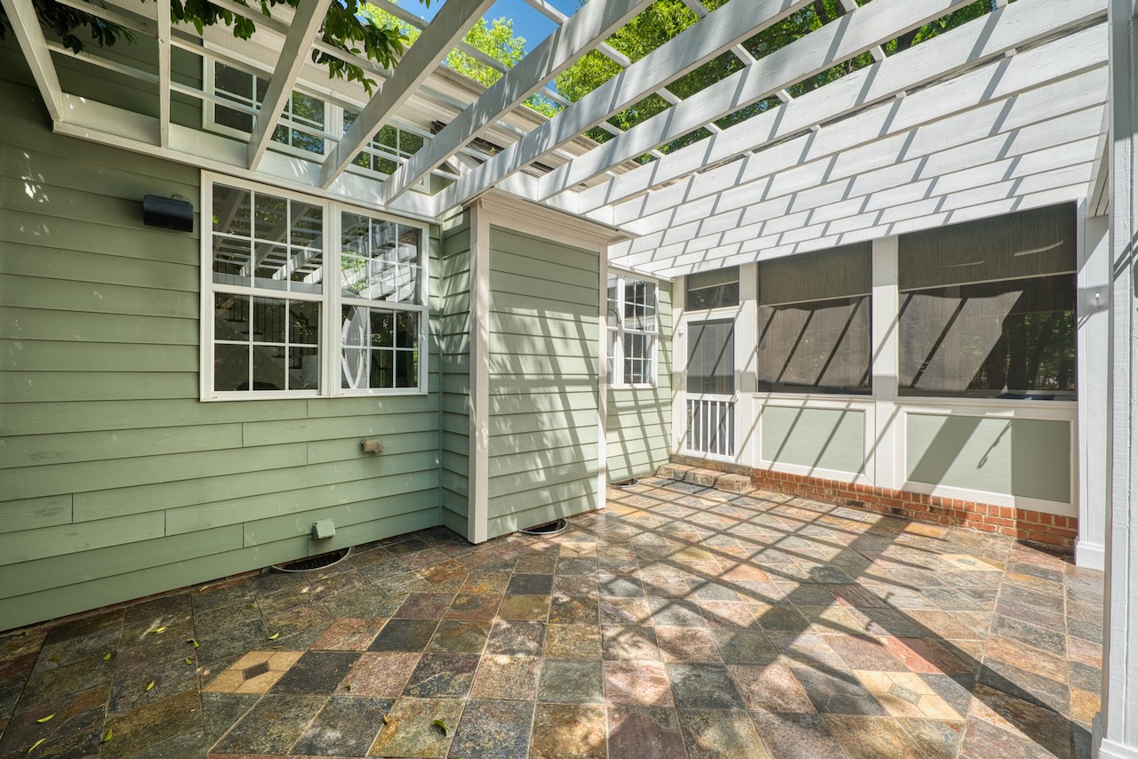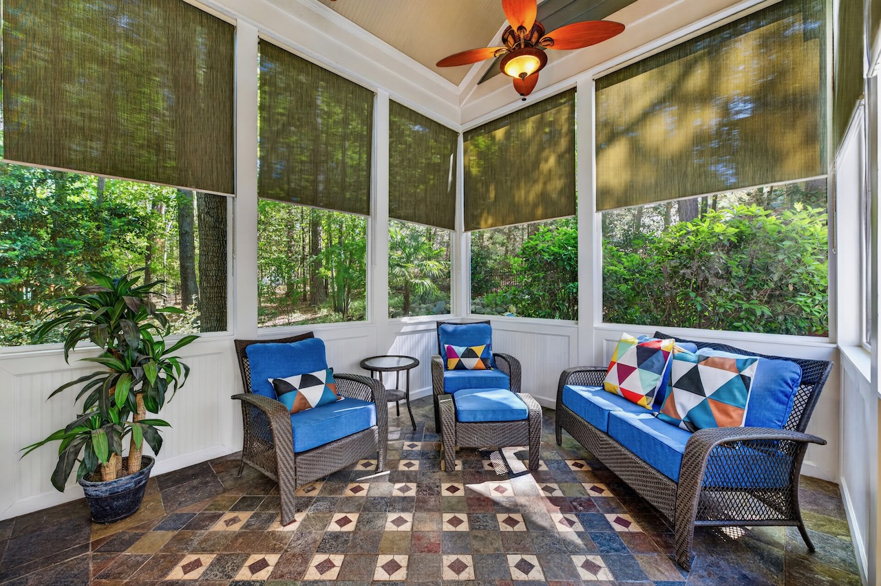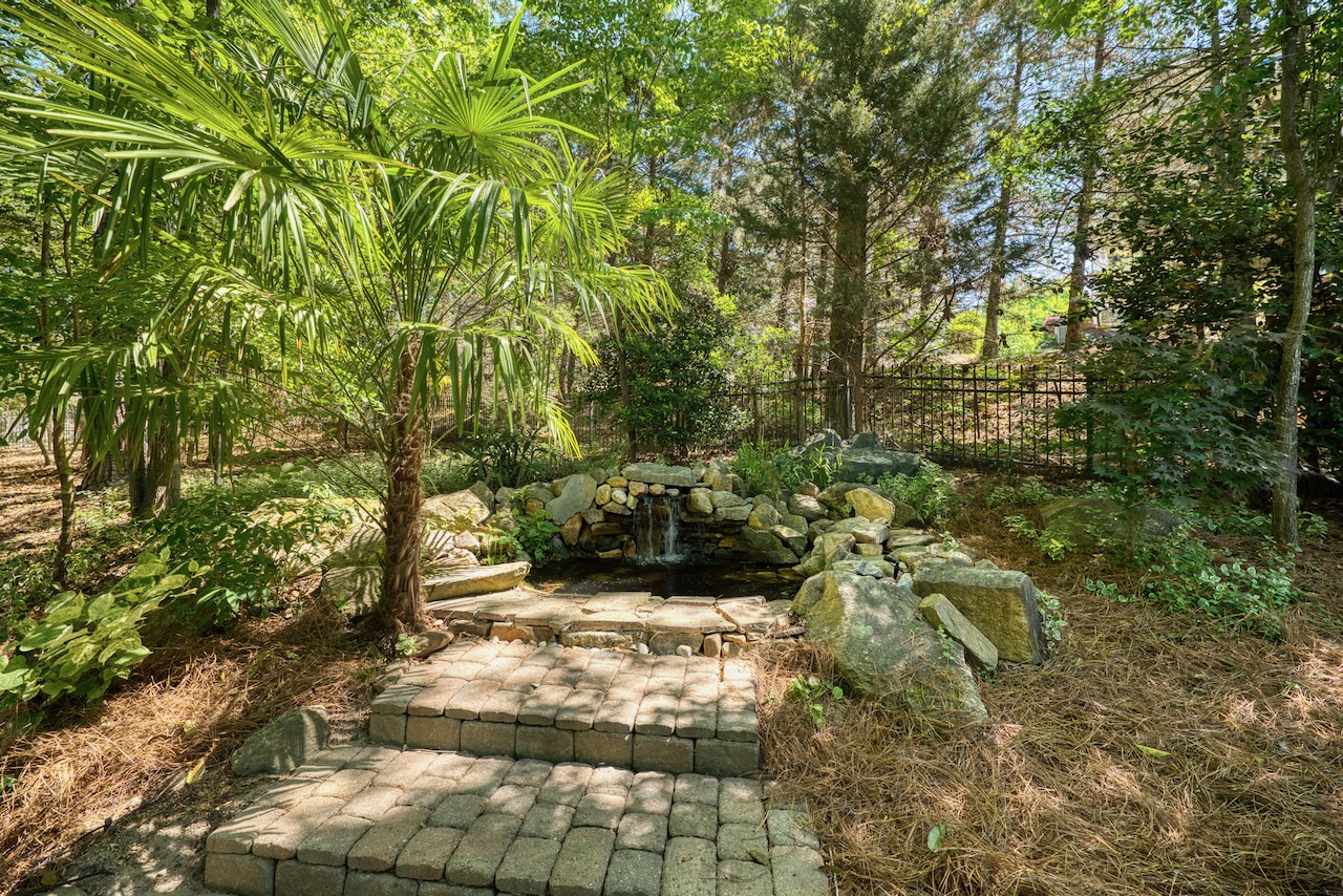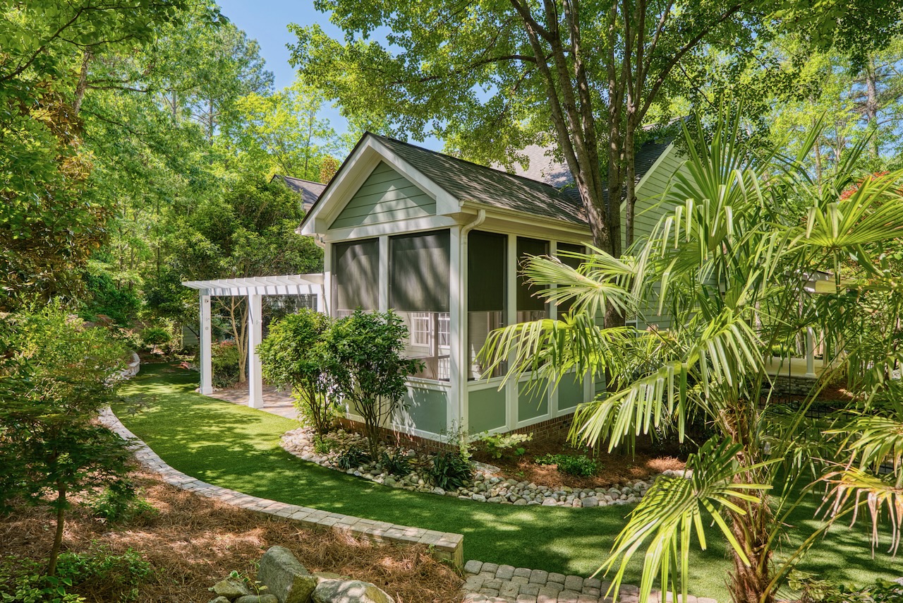 Outdoor living is a standout feature. The screened porch with custom slate flooring opens to a private patio beneath a pergola, surrounded by fragrant tea olive and gardenia. The pet-friendly artificial turf backyard offers a low-maintenance solution, and the tranquil pond, paired with a striking palm tree, creates a unique focal point with the option to add koi.